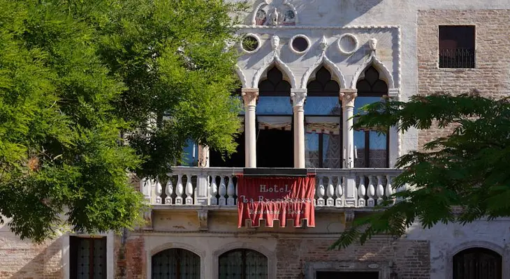 "This fourteenth-century palazzo is a low-budget gem (in Venetian terms), occupying much of one side of a quiet square just off the main waterfront."