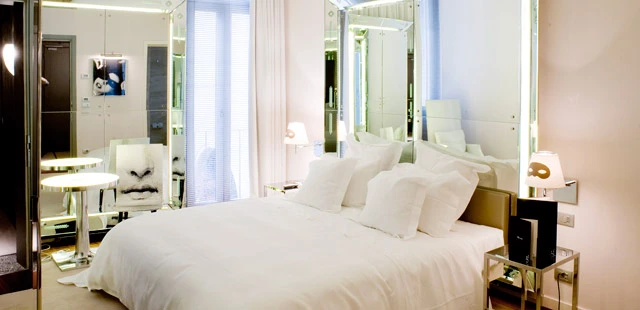 “The beds, dressed in white linens, have oversized mirrors as headboards, and the custom nightstand lamps have a simple black mask design, a nod to the famous Carnevale.”