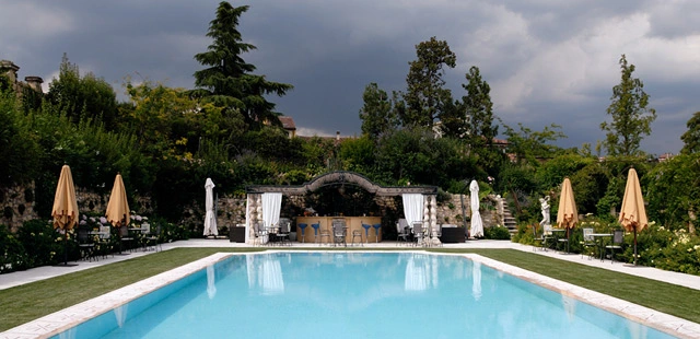 Take the hotel shuttle to Verona, the city of Romeo and Juliet, stroll in the gardens surrounded by 300 varieties of flowers overseen by Sr. Facchini — he stops by every morning to check the gardeners’ work — or relax by the deep blue pool surrounded by frescoes.