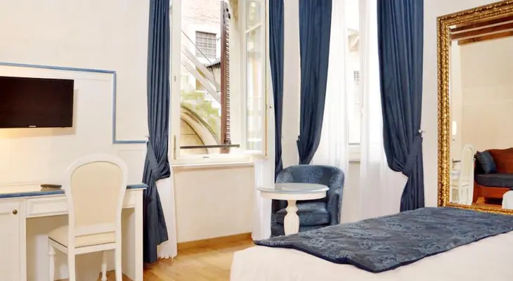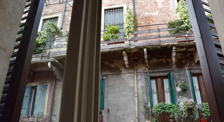 “Classic townhouse close to Juliet's balcony in Verona's historic quarter with exposed stone walls and views of the Case Mazzanti.”