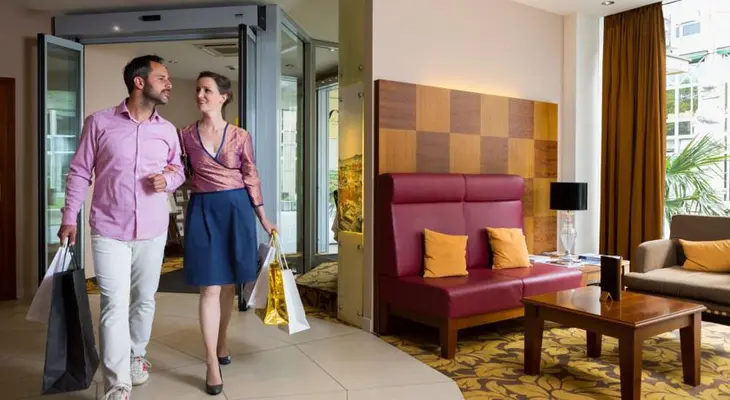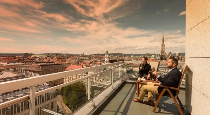 "This hotel is located opposite the Stadtpark and on the upper floors of Vienna's high-rise Gartenbauhochhaus."