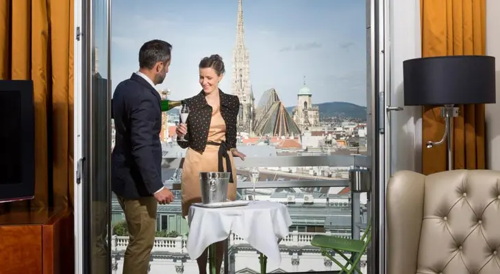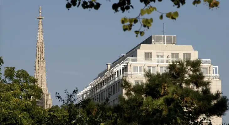 "This hotel with 64 rooms is located on the Ringstrasse and from its 13th floor you get a splendid view of the treelined avenue."