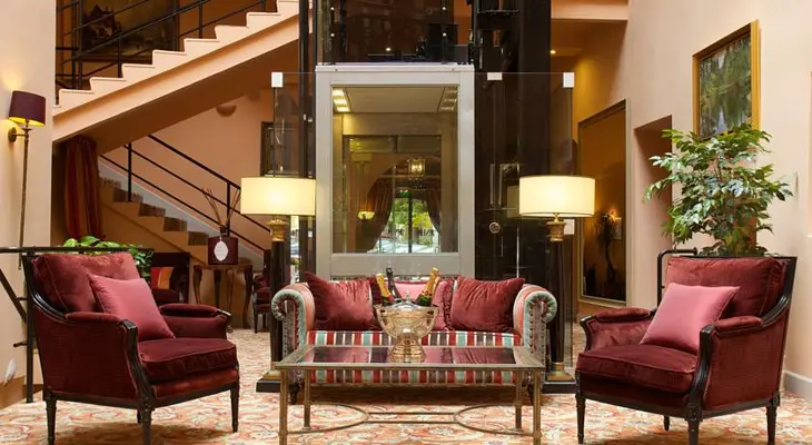 "A central, intimate hotel housed in a muchmodernized sixteenth-century building, with plain but elegant rooms around a glass-roofed courtyard."