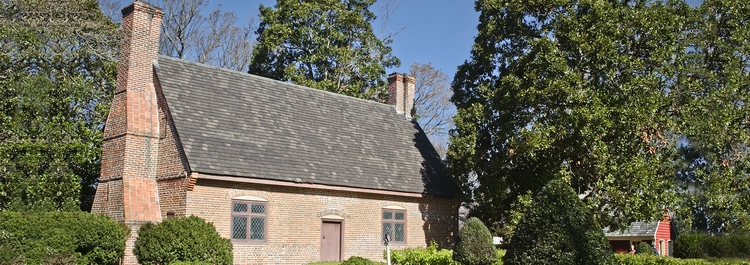 English cottage architecture of the period, with a protruding chimney and a steeply pitched roof. The four-room early plantation home has a 17th-century garden with characteristic hedges. — Fodor's