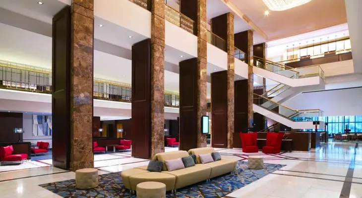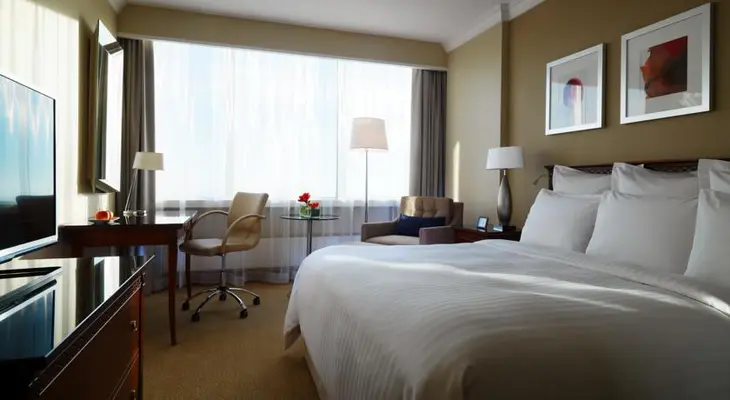 “Across from Central Station and inside the Lim Center high-rise, this 518-room American-style Marriott boasts a friendly English-speaking staff and fantastic views of Central Warsaw from every room.”