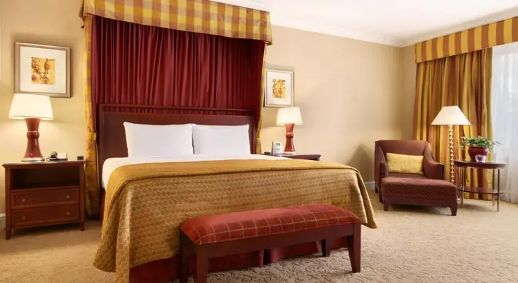 "Ample guest rooms are clothed in elegant furnishings and sunny hues; posh executive suites are tailored to suit business travelers and to accommodate small meetings."