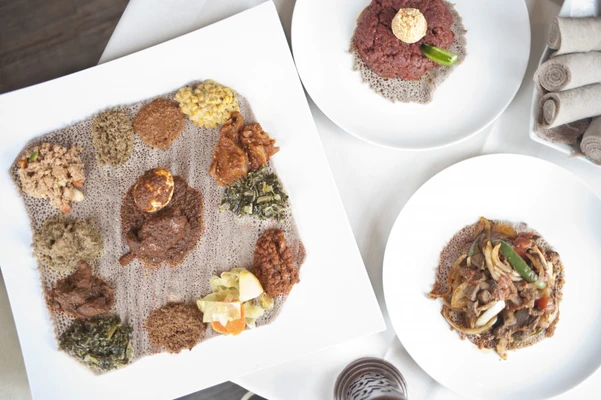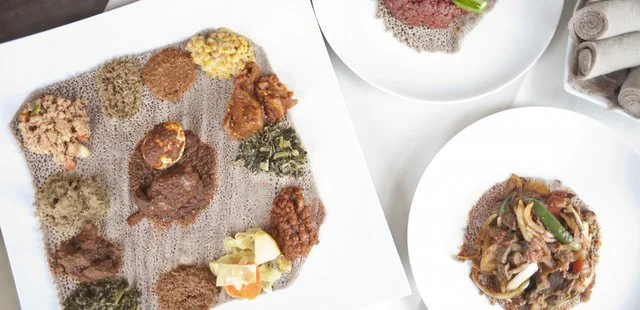 “In a light-filled town house, a favorite of diplomats and Georgetowners for its authentic spicy or mild seafood (shrimp tibs), chicken (doro wat, infillay), injera, stews, African beers, honey wine.”