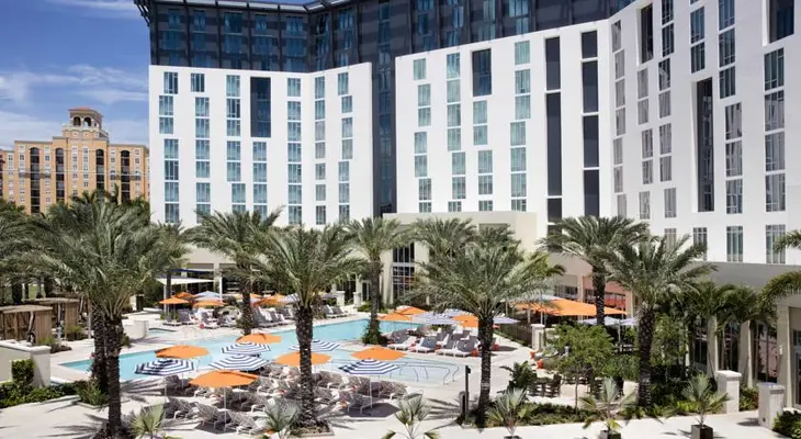 In downtown, the contemporary business hotel situated next door to the county convention center has a pool with cabanas many resorts would envy. — Fodor's