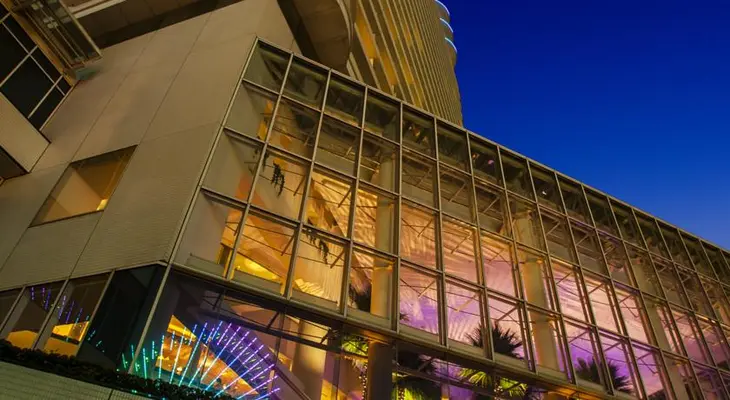 The closest hotel to the beach in the Minato-Mirai area resembles a wind-filled yacht sail and the interior, including the spacious lobby, has a relaxing air. — Michelin Guide