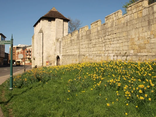The 13C walls follow the line of the old Roman fortification to the north of the cathedral and are built on the defensive embankment built by the Vikings. — Michelin Guide