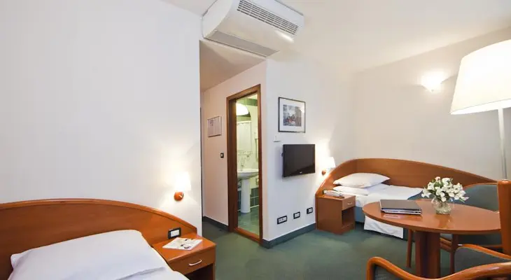 "Rooms here are smart and comfortable, if a little small and cramped, with en-suite facilities, a/c and TV. Diagonally opposite the train station. 801–1100Kn."