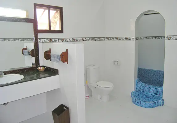 “Arabian Nights has closely spaced rooms in stone cottages just back from the beach, including some with sea view, and a restaurant.”