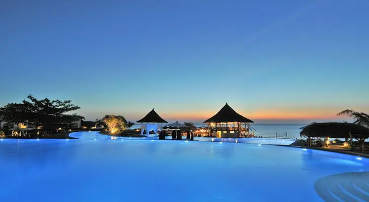 “The Royal Zanzibar Beach Resort is an upscale, all-inclusive hotel set on 20 acres of gardens overlooking the Indian Ocean in the northwest tip of the island.”