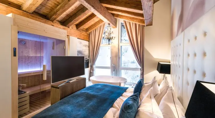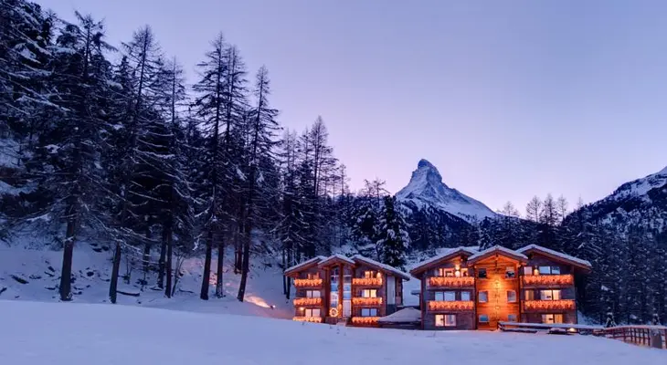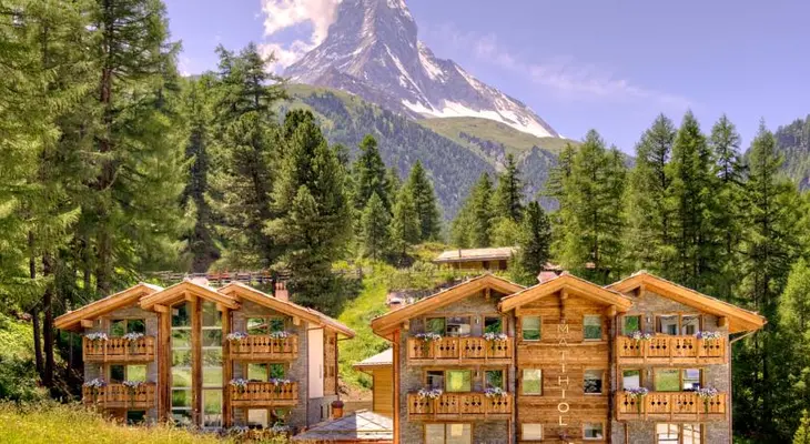 “The sharp peak of the Matterhorn provides visual drama to the backdrop of Hotel Matthiol, which is nestled among evergreens on the periphery of Zermatt, Switzerland.”