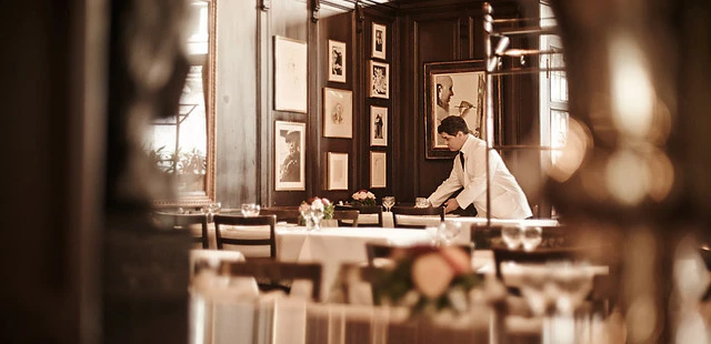 "A nearly century-old institution, the dining room heaves with dark wood paneled walls, white tablecloths, white-jacketed servers and hearty, meaty dishes."